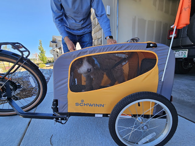 Charlie didn't want to be left out of the excitement, so we bought him a bike trailer to go on the back of the eBike. The bike trailer weighs 25 pounds. When you throw Charlie in there, that's way too heavy for me to pull on my regular bike (hence, another perk of an eBike).